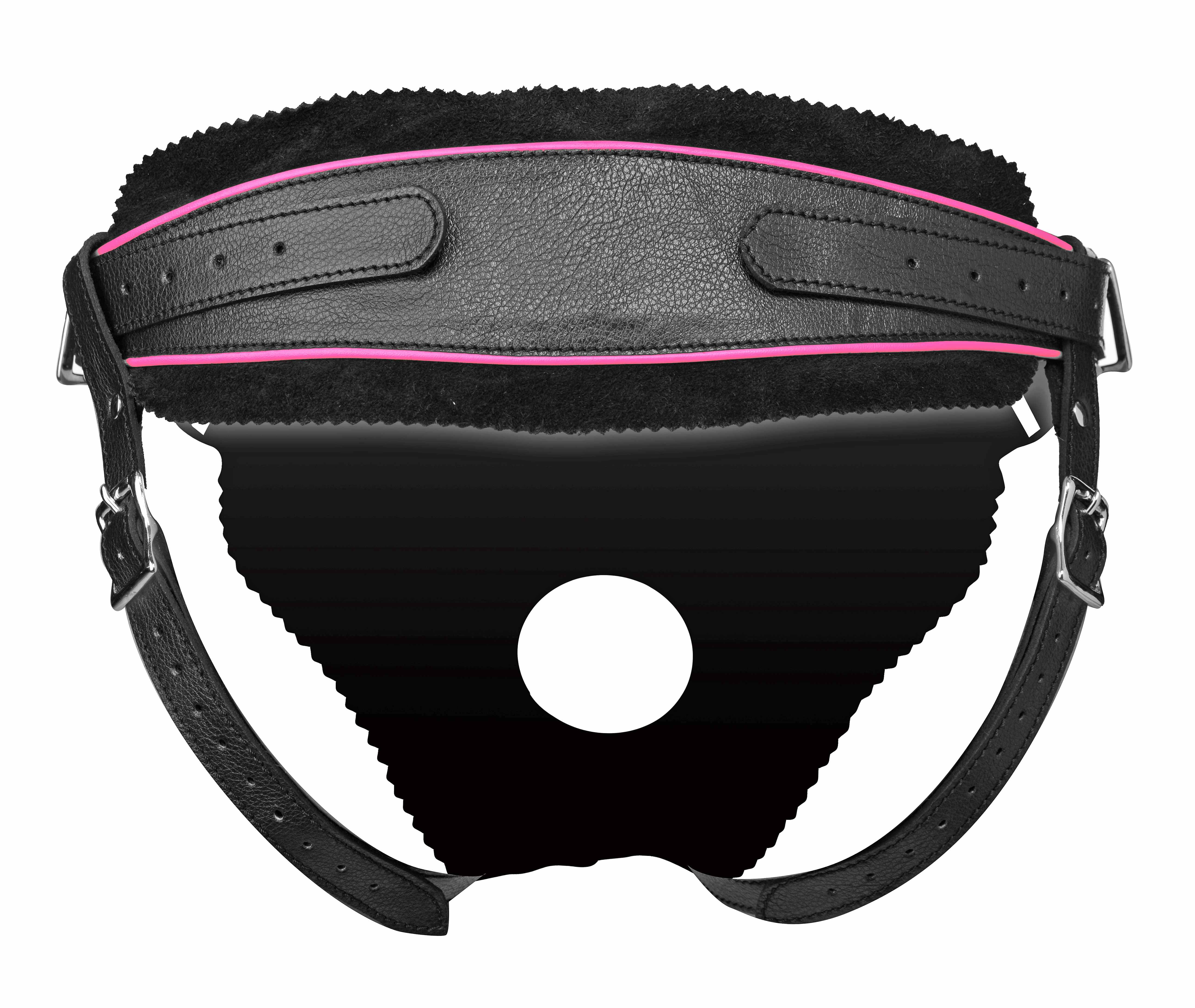 This vegan-friendly strap on harness has exciting pink accents and a low-cut designed to help draw their eye and keep their attention fixed on you. The belt is fully adjustable, with buckles at the hips and rear straps for a tight fit. The back is wide for more support, and lined with soft fabric for comfort. The front has an easy snap-in feature. Using one of the two included steel O-rings, you can add your favorite dildo, with multiple size options. The open-back design still leaves everything open for easy access.